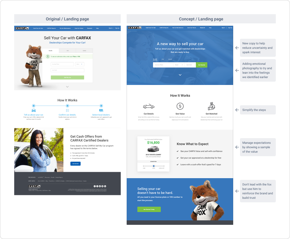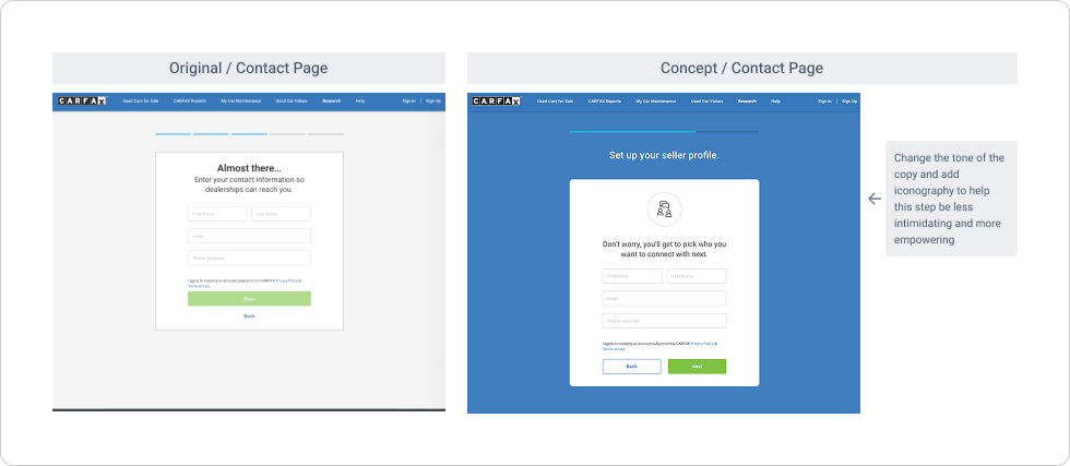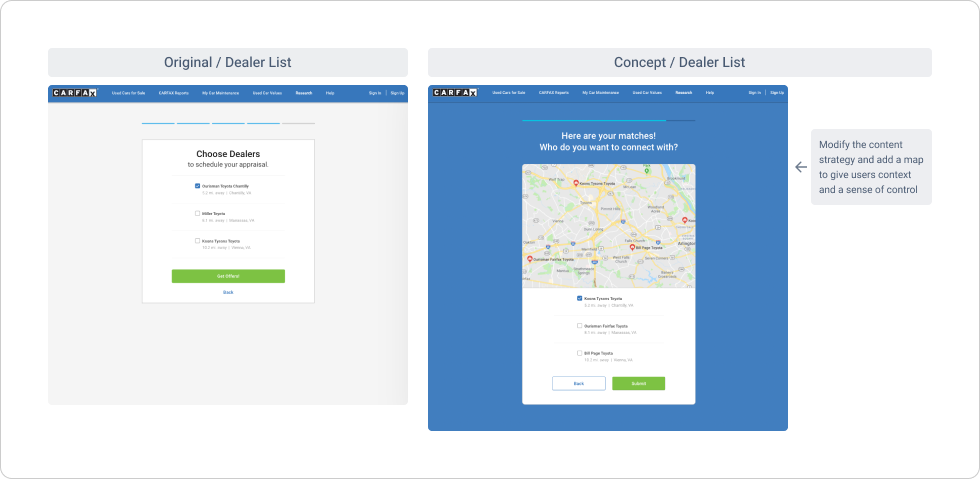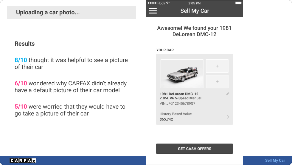 Our goal was to simplify the process for owners and give dealerships stronger, CARFAX-backed leads. I partnered with one PM and three engineers, running interviews, workshops, and 10 rounds of usability testing to shape the pilot.
