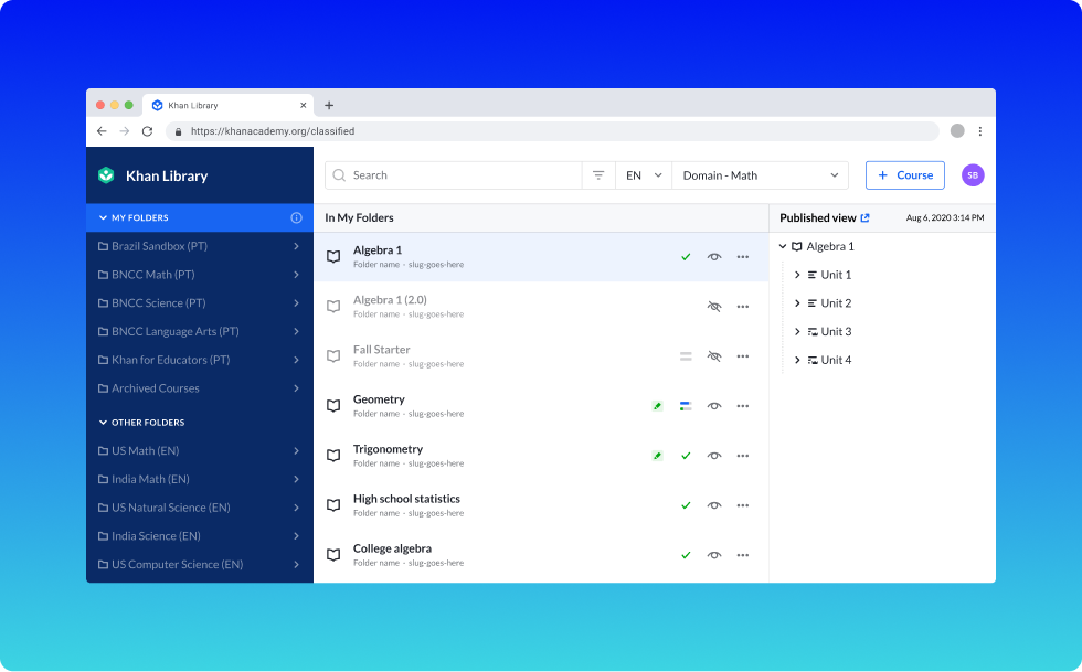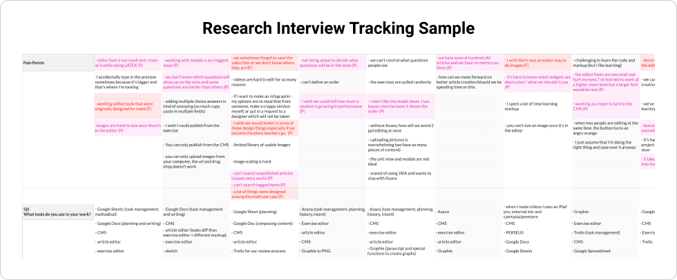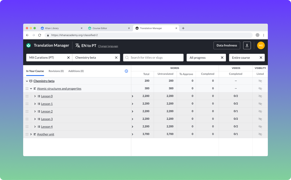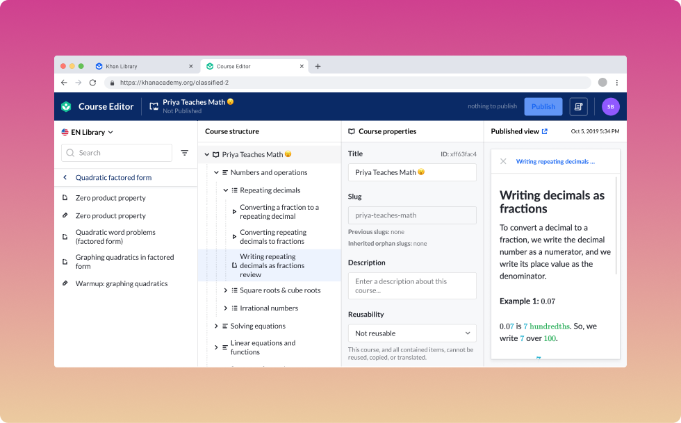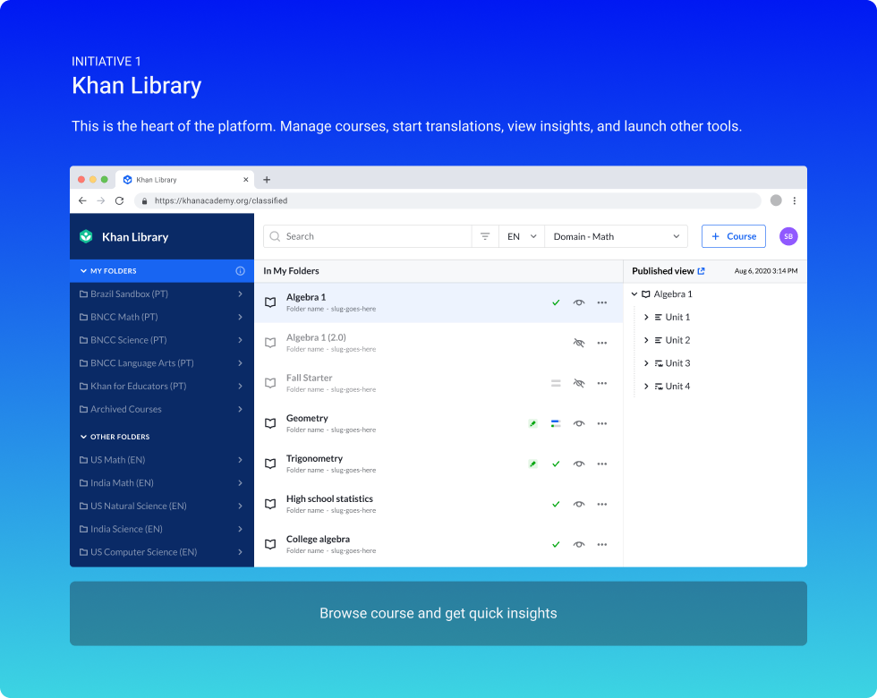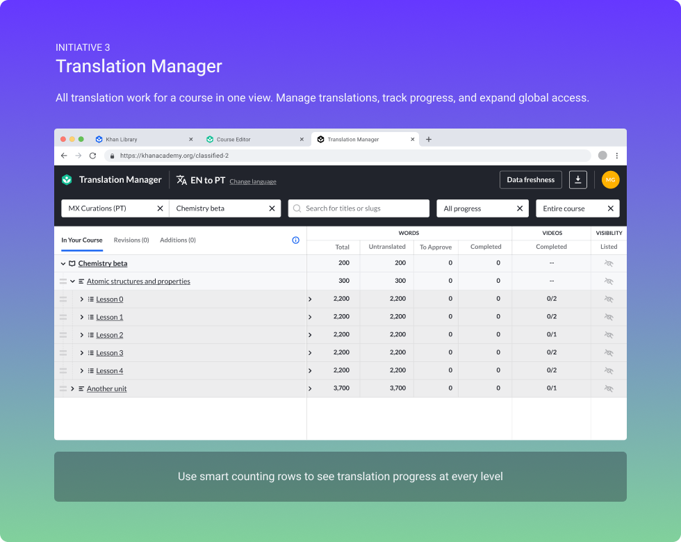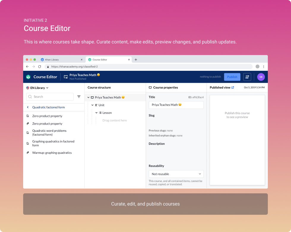 At Khan Academy, I introduced three new tools: Khan Library, Course Editor, and Translation Manager, replacing 18 separate tools that slowed content teams down.